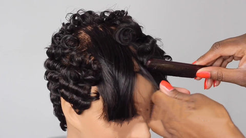 Continue to wrap the curl away from your face from the fitting crown to the nape of your neck. Switch to the front left once you've reached the middle back. Wrap each curl away from your face from above the left ear to the nape of your neck. If you get a high density wig with more hair, you need spend much more time to treat it.